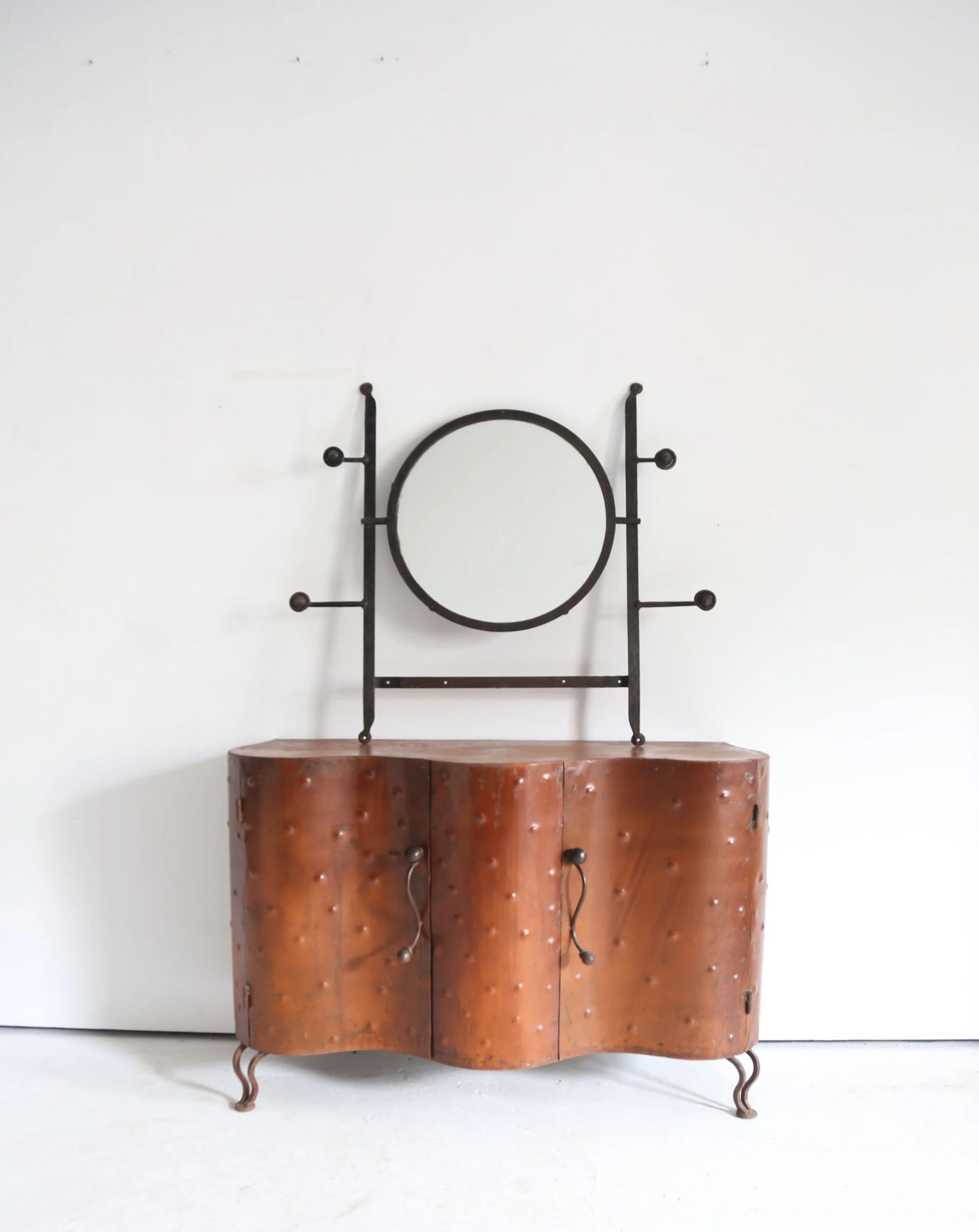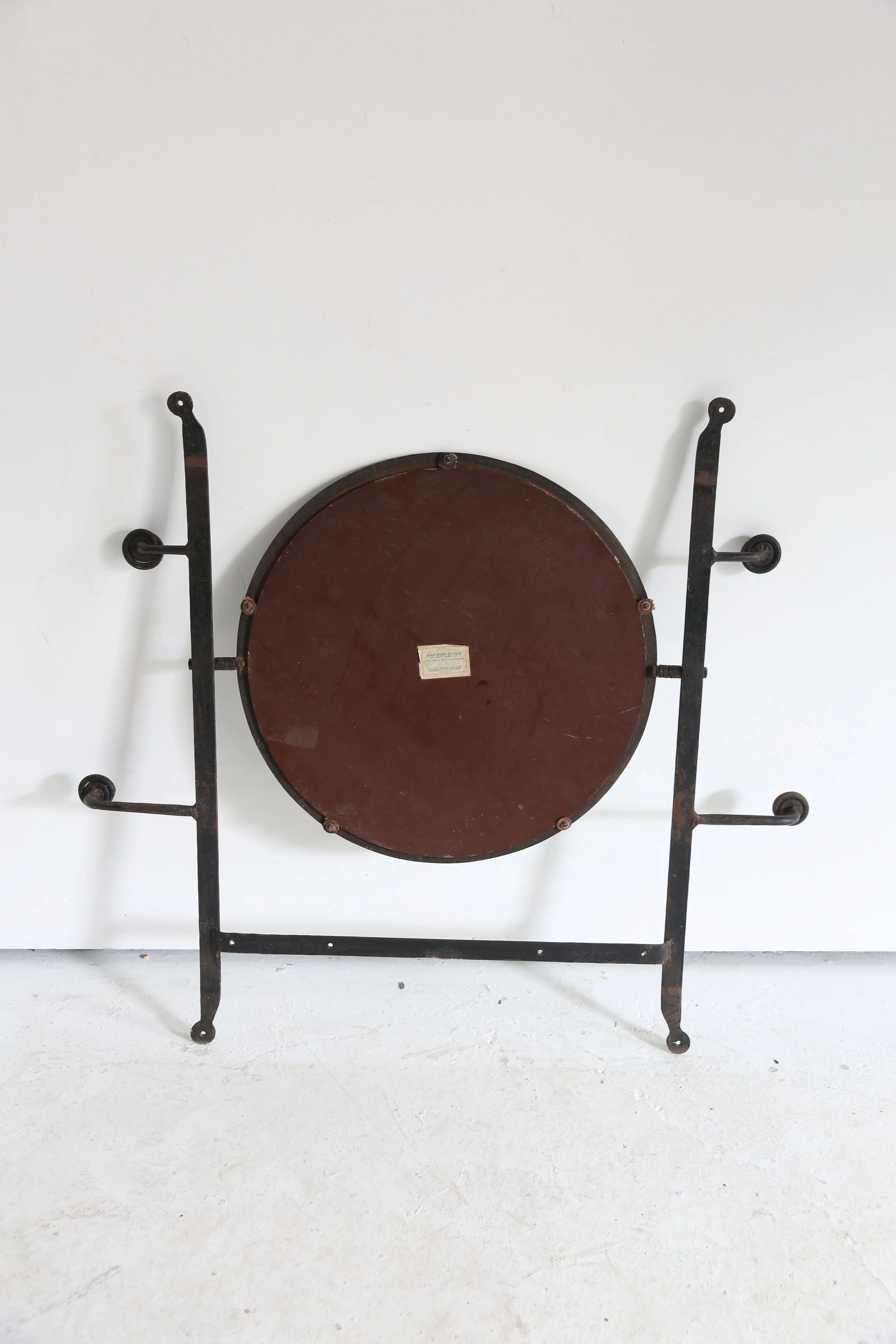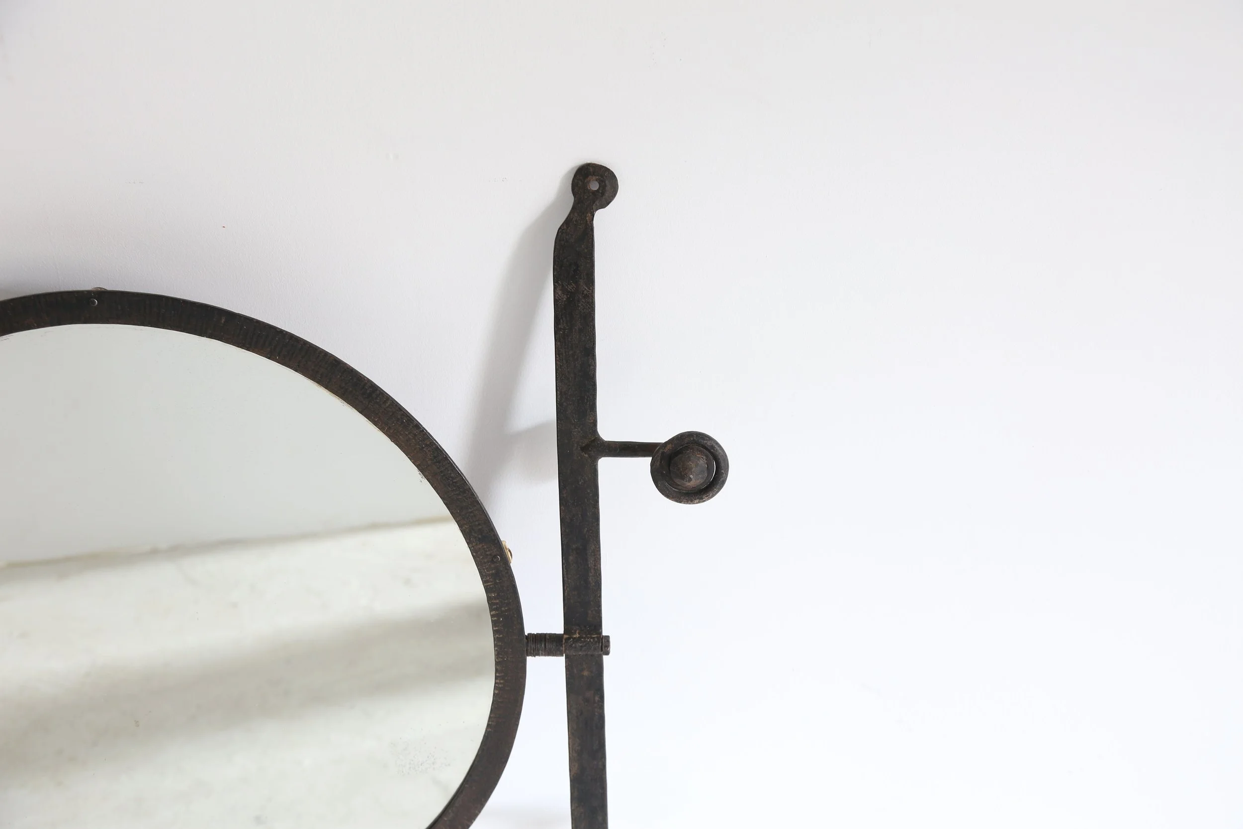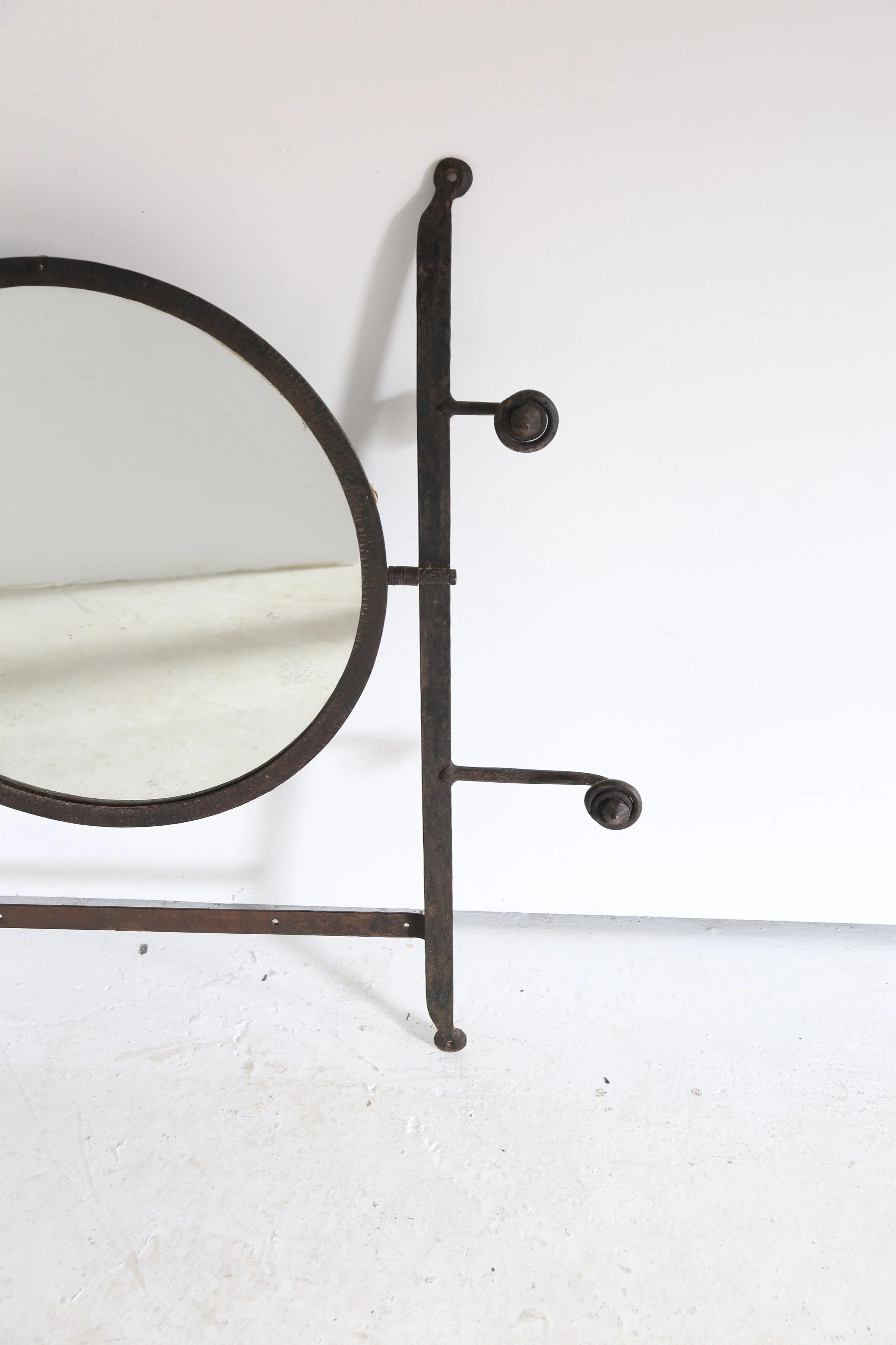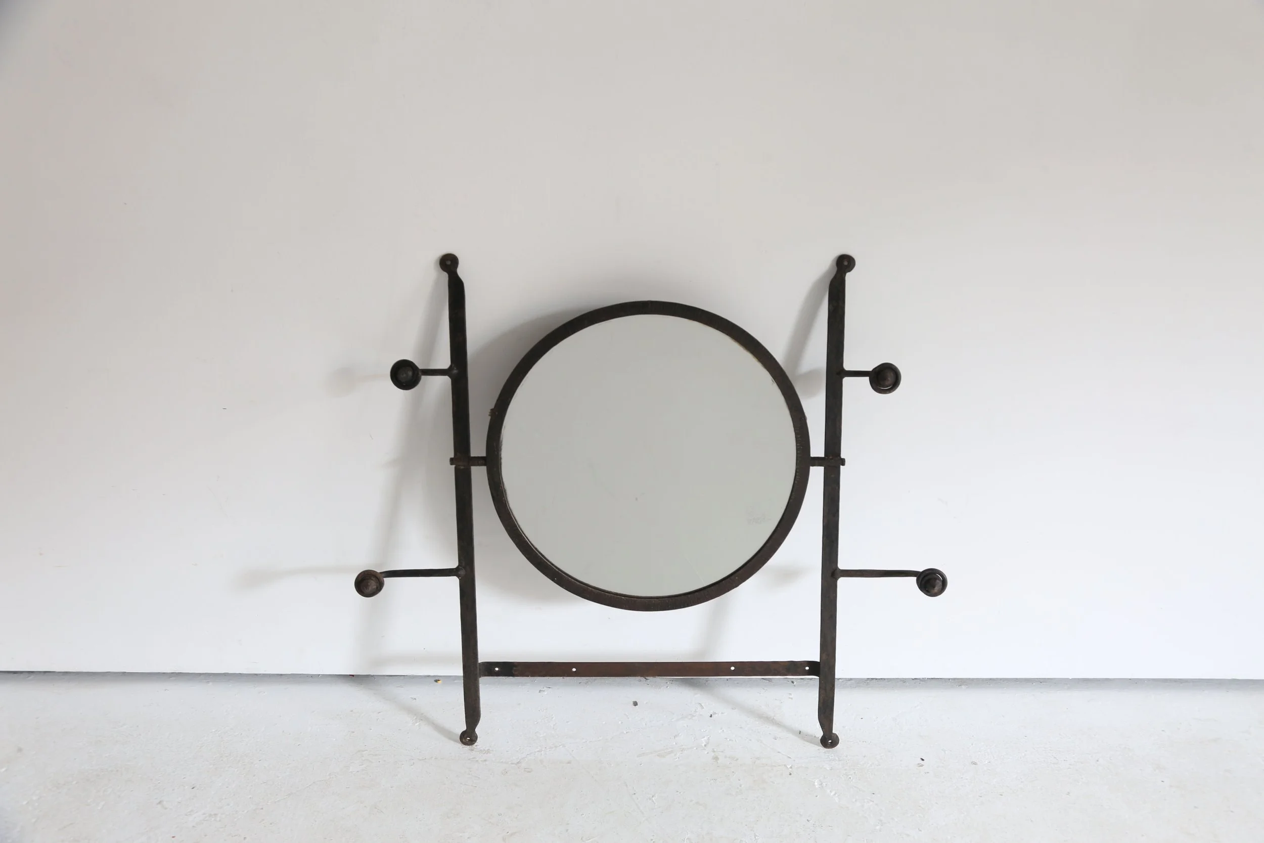 Charming artisanal ironwork hallway mirror adorned with hooks.