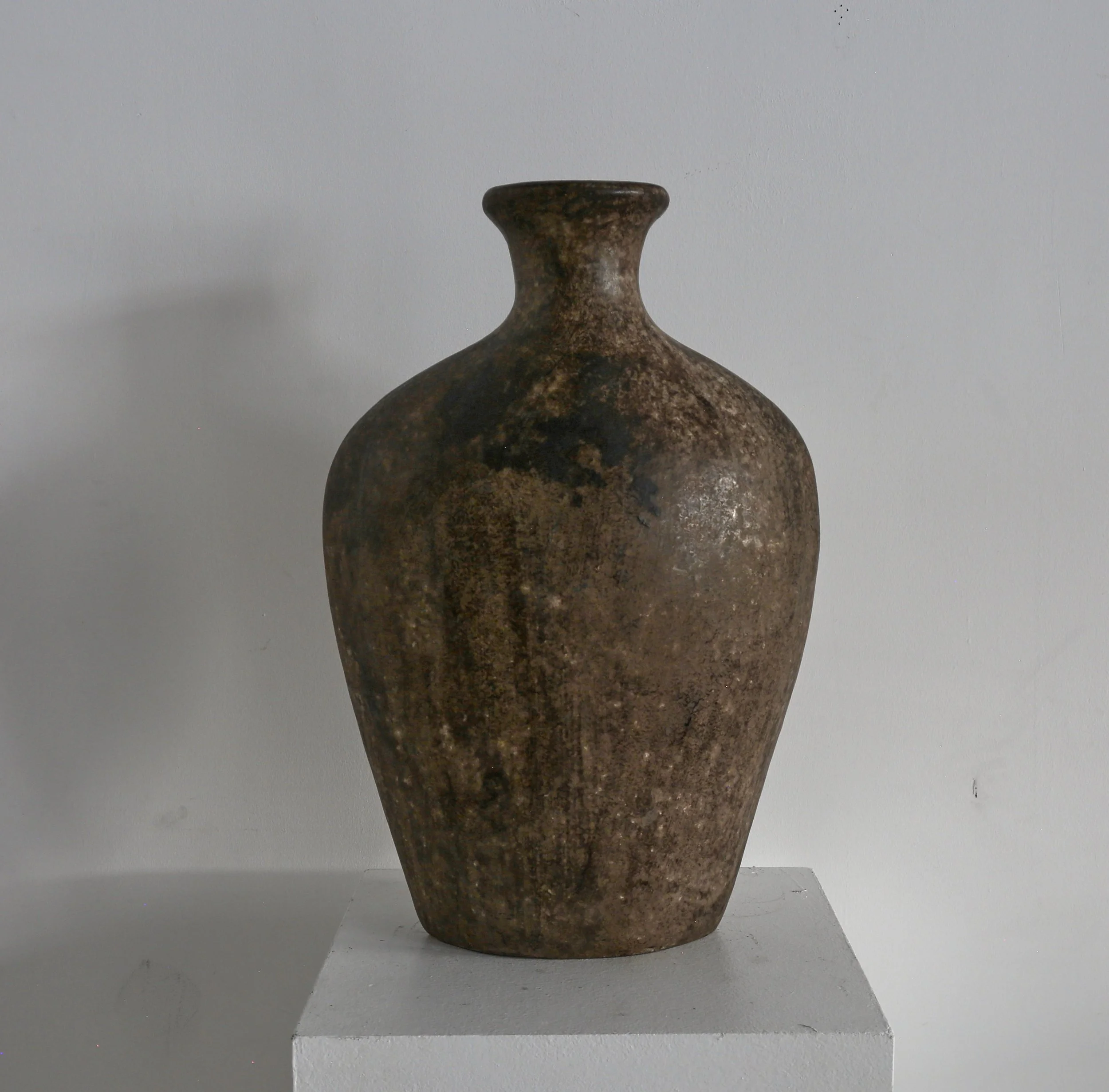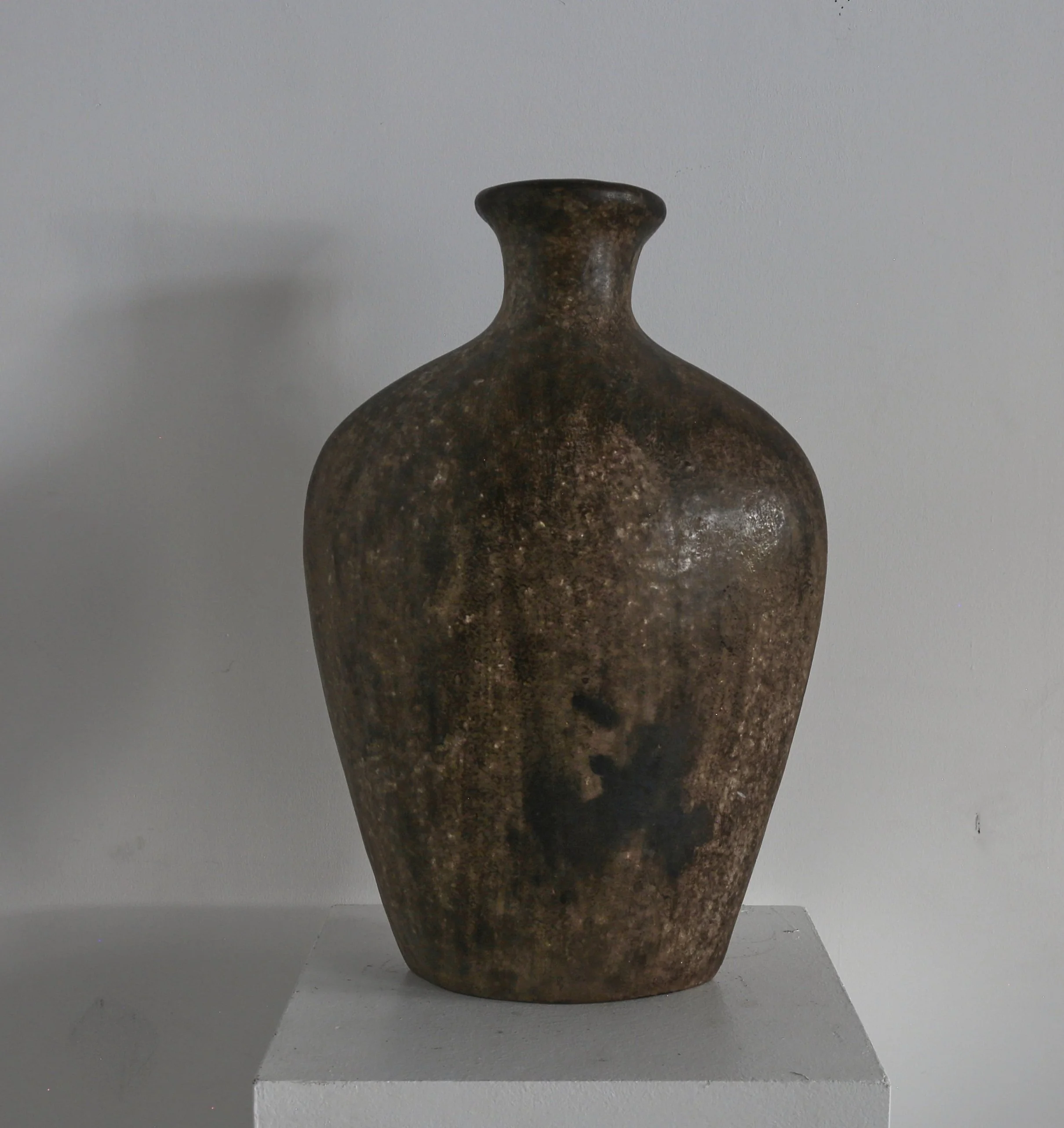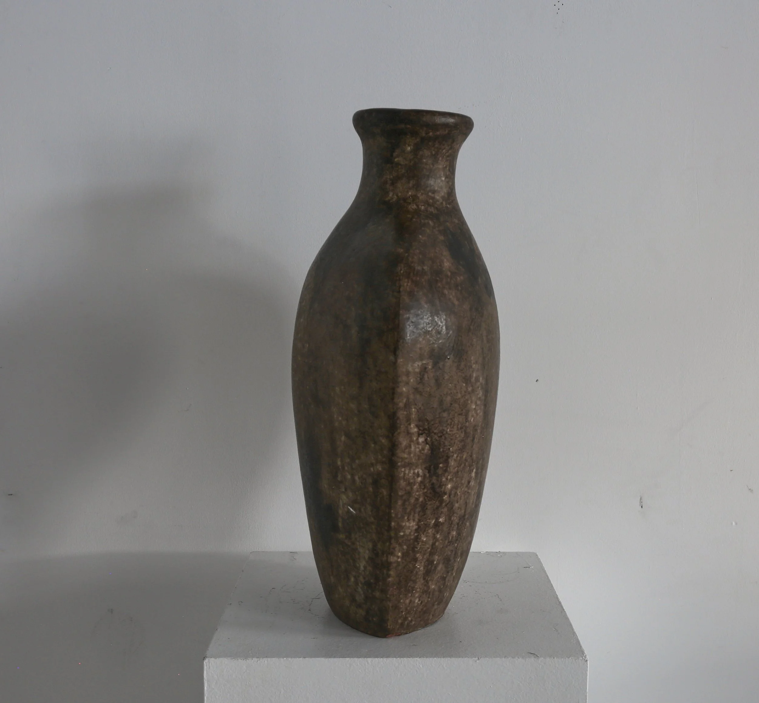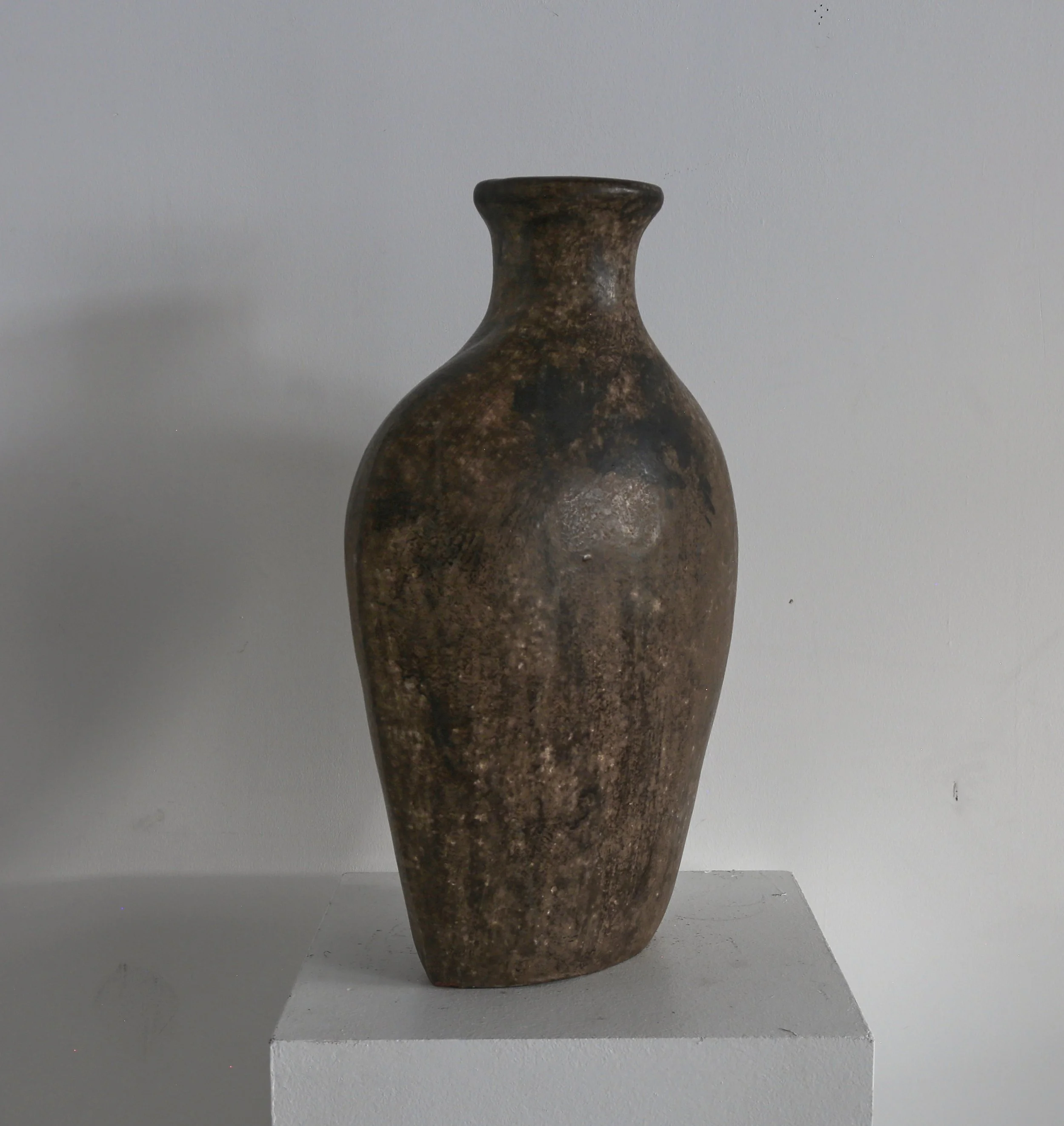 Mottled glazed ceramic, almost the size of a torso.