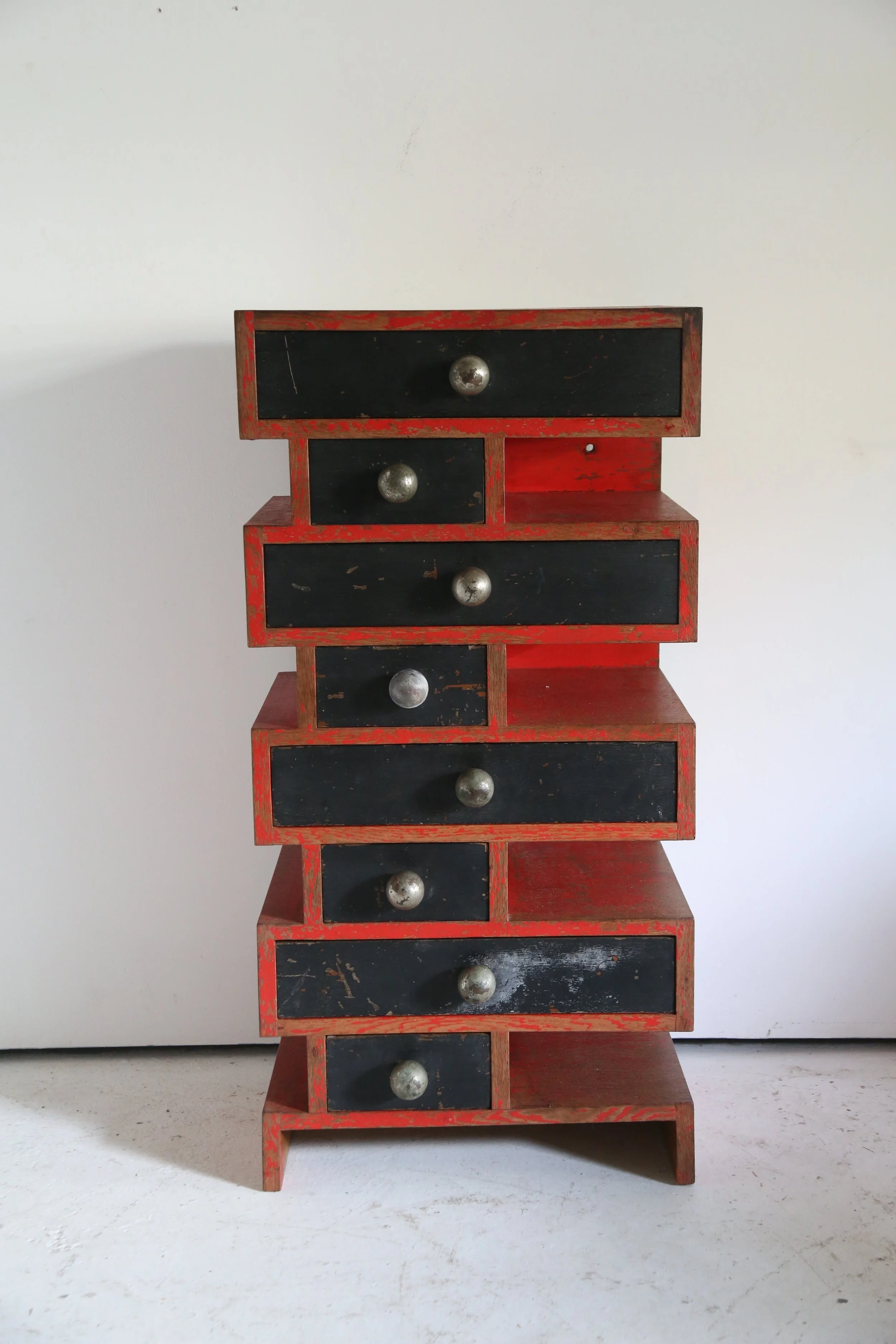 Eight stepped solid wood drawers, with seven brass ball handles on, one has been replaced at some point. Found in an abandoned workshop in the South France.