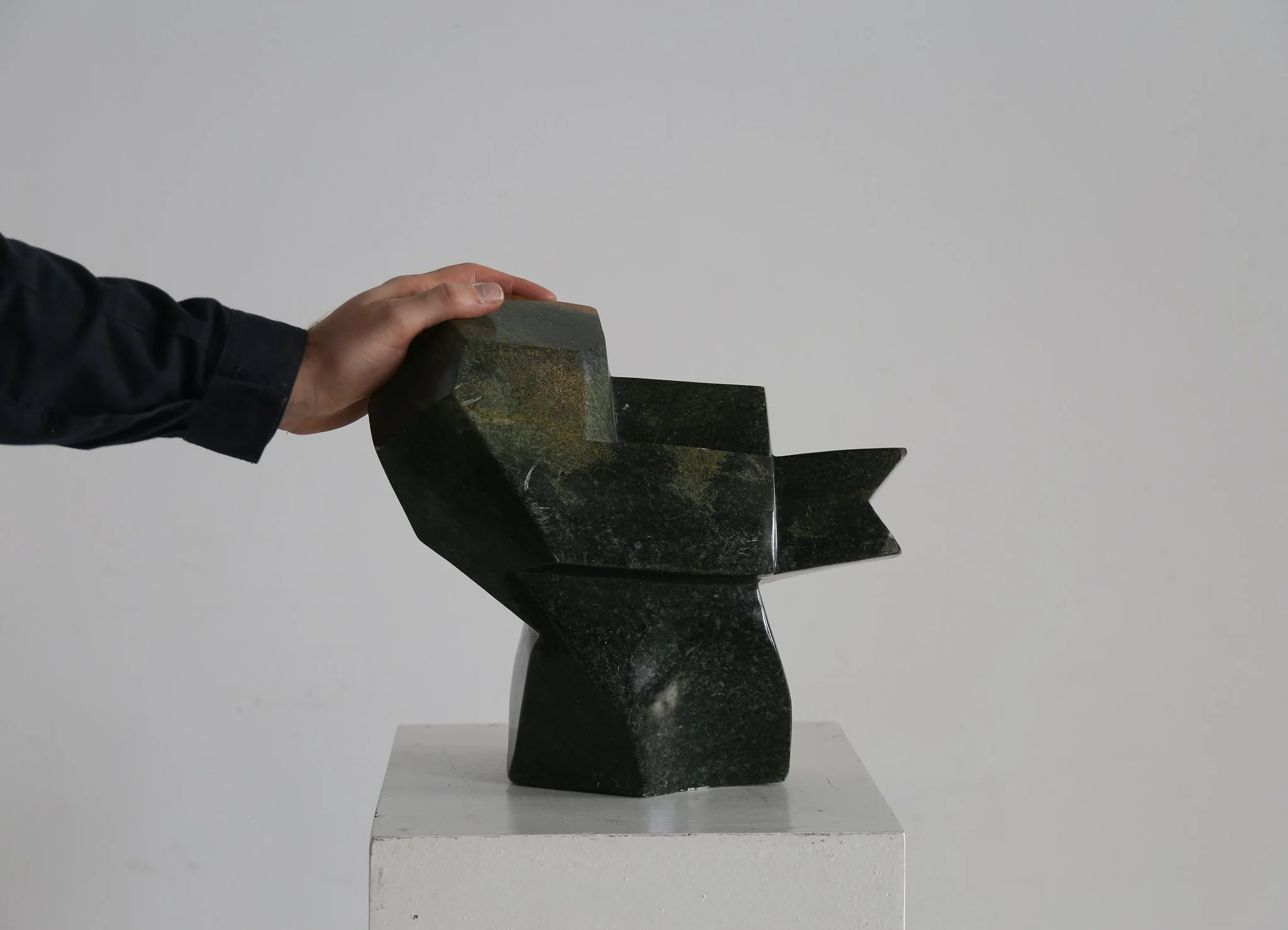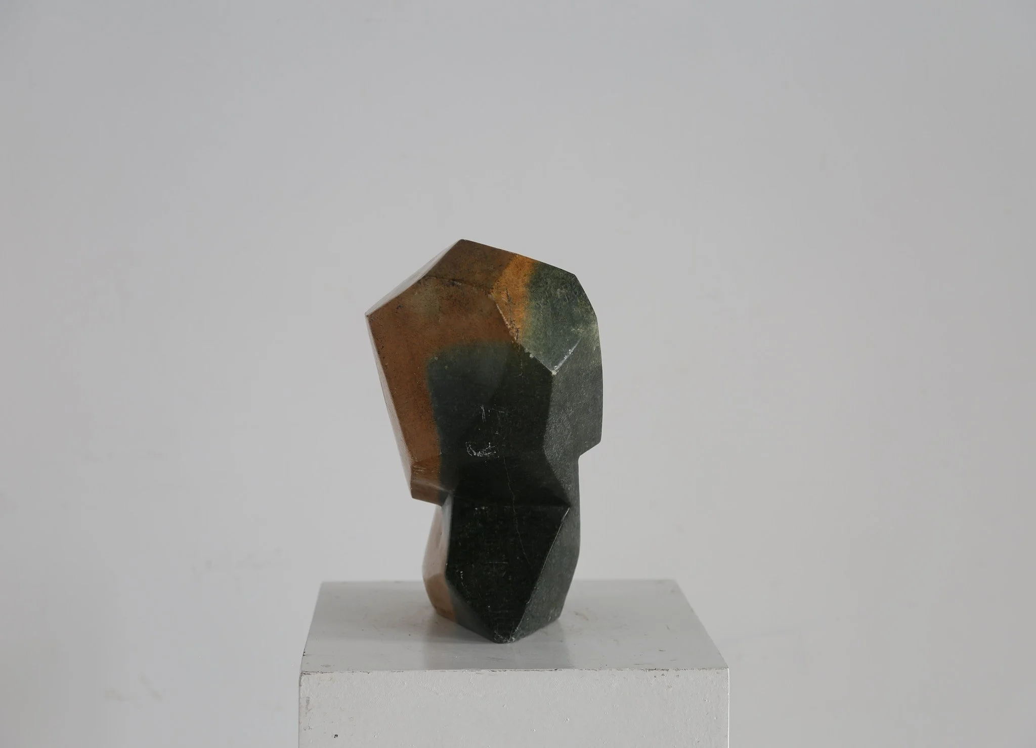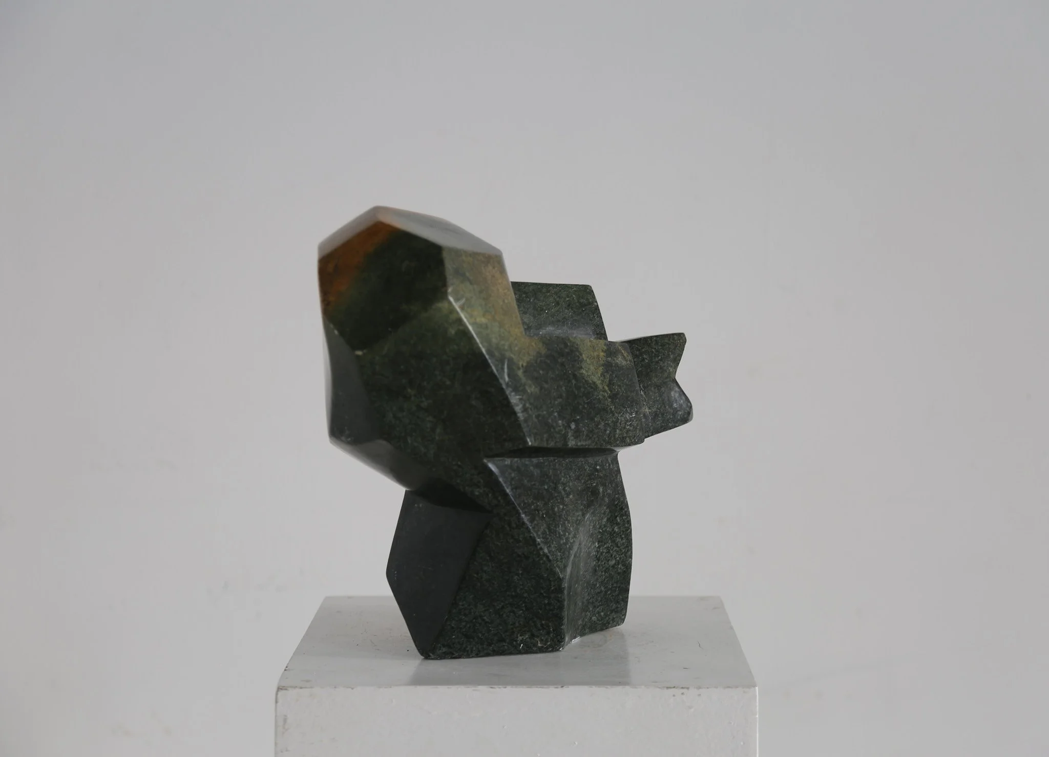 Impressive 1960s hand carved abstract sculpture in serpentine stone, with a rich two tone quality. Displaying on either side of this work.