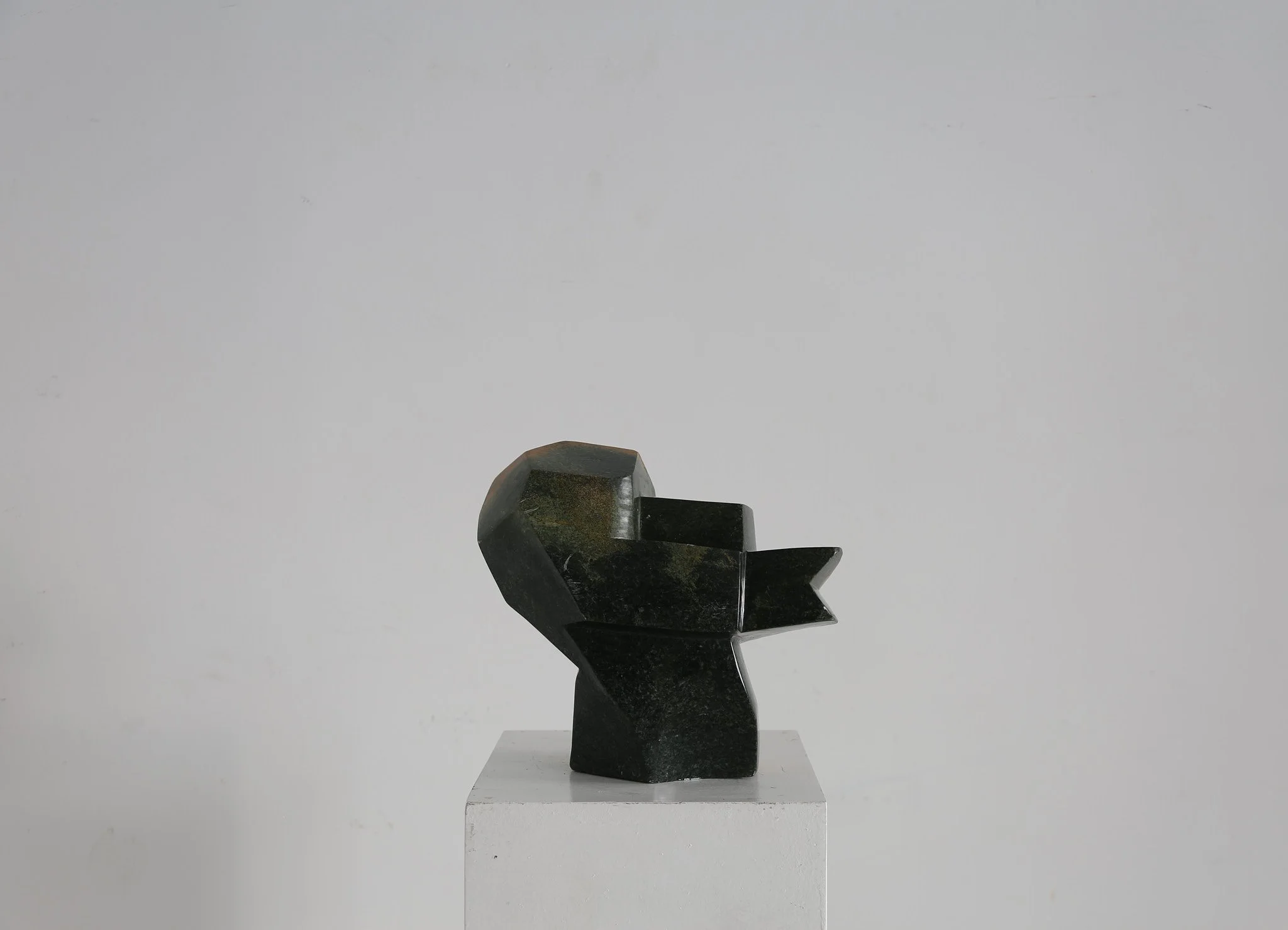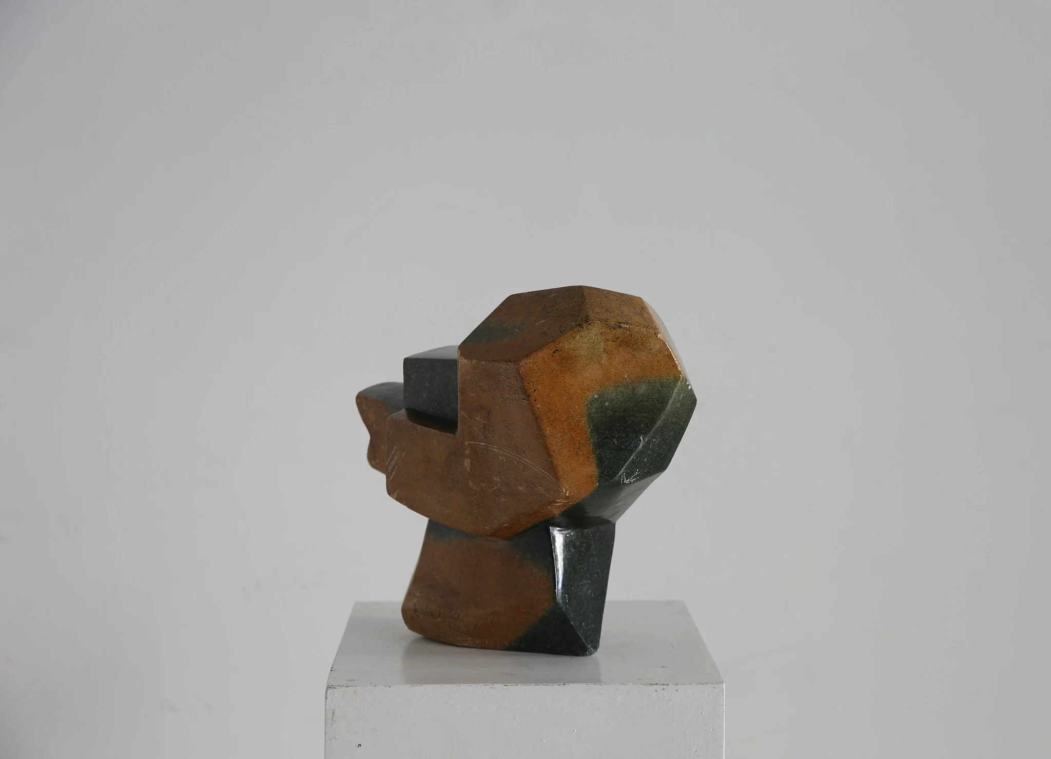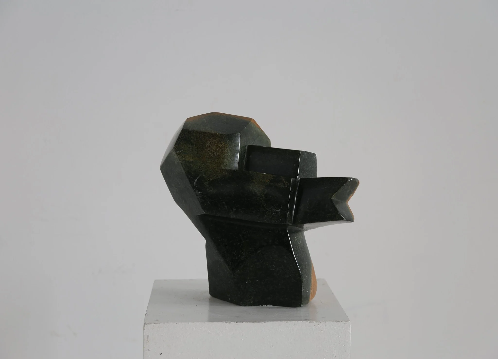 Impressive 1960s hand carved abstract sculpture in serpentine stone, with a rich two tone quality. Displaying on either side of this work.