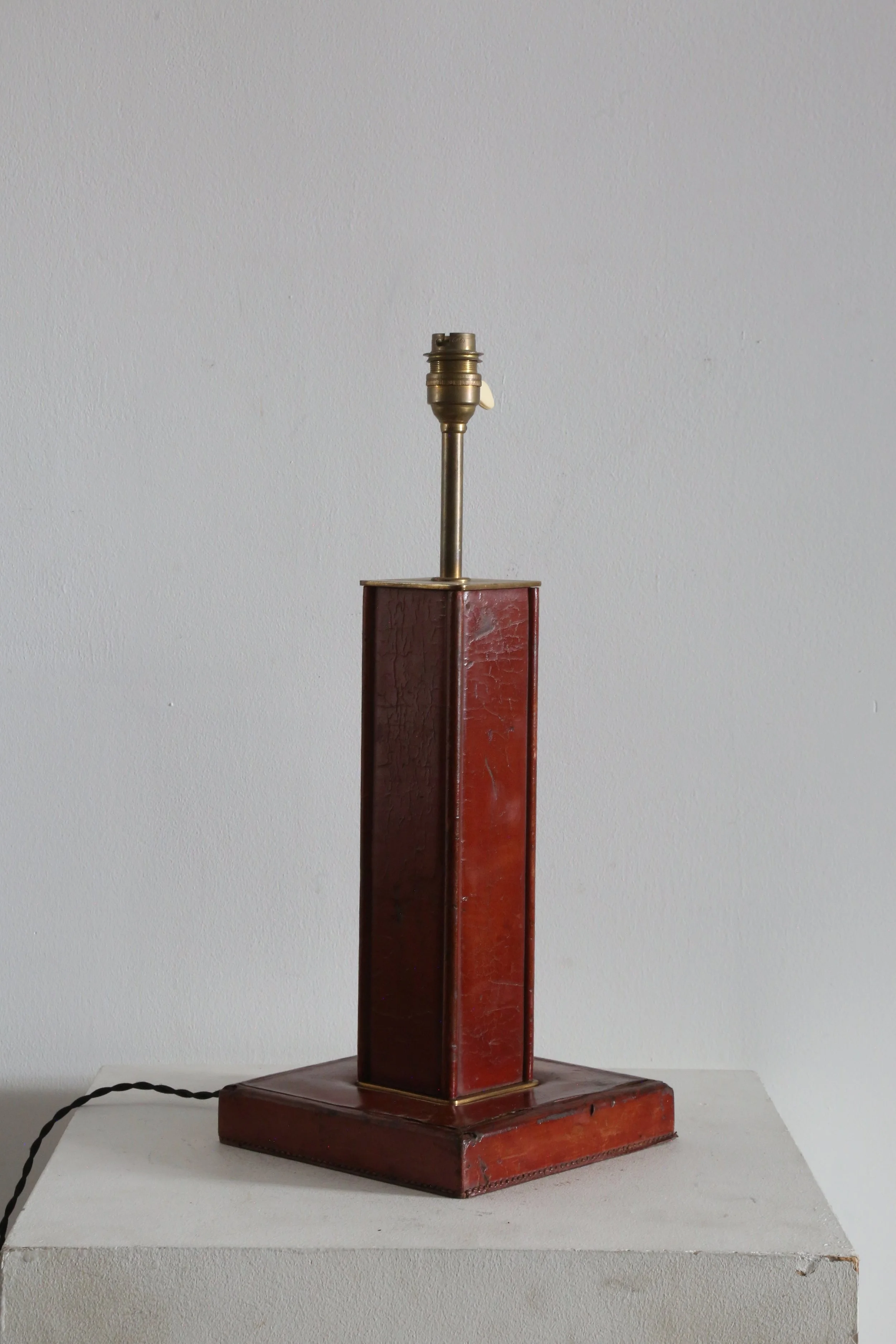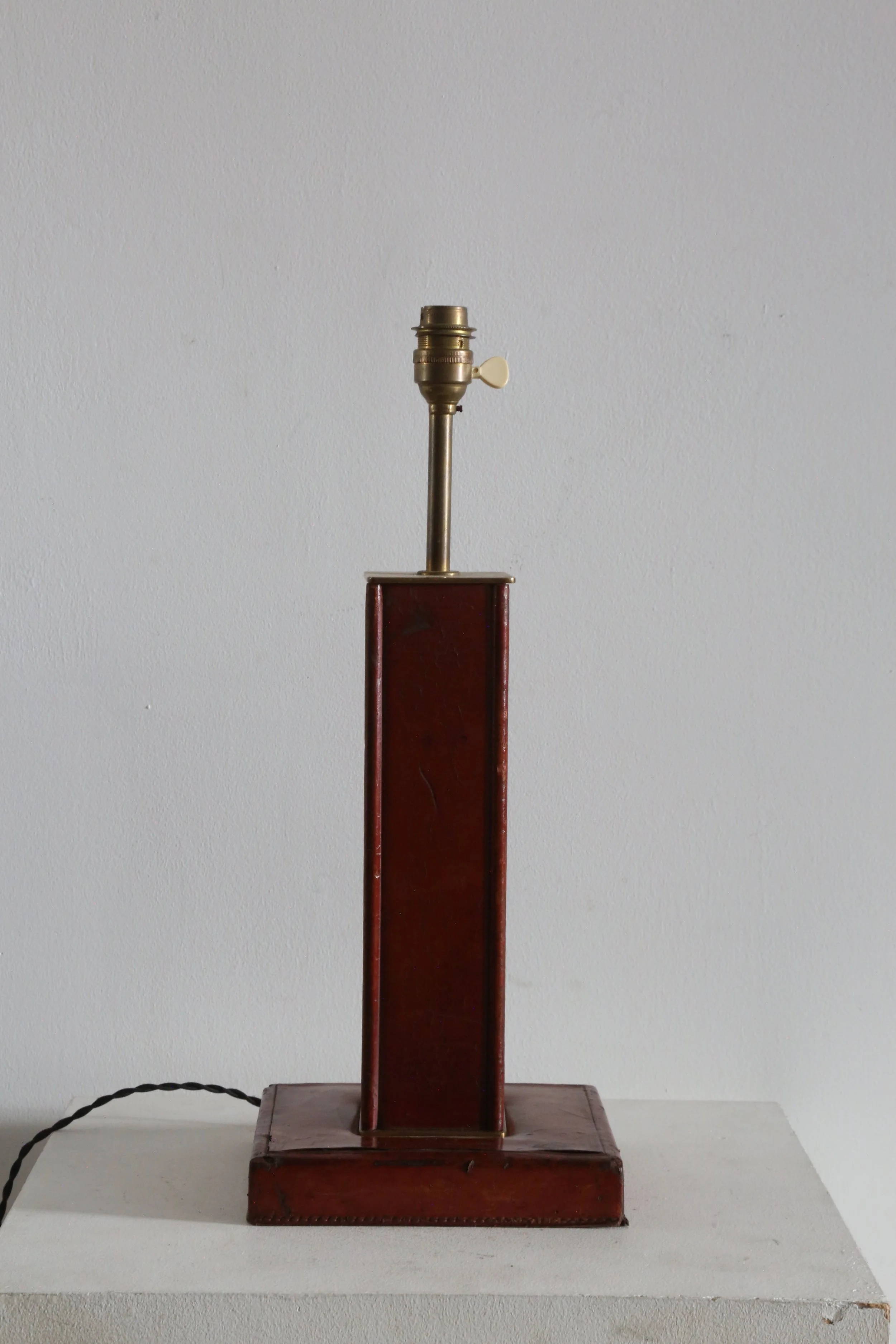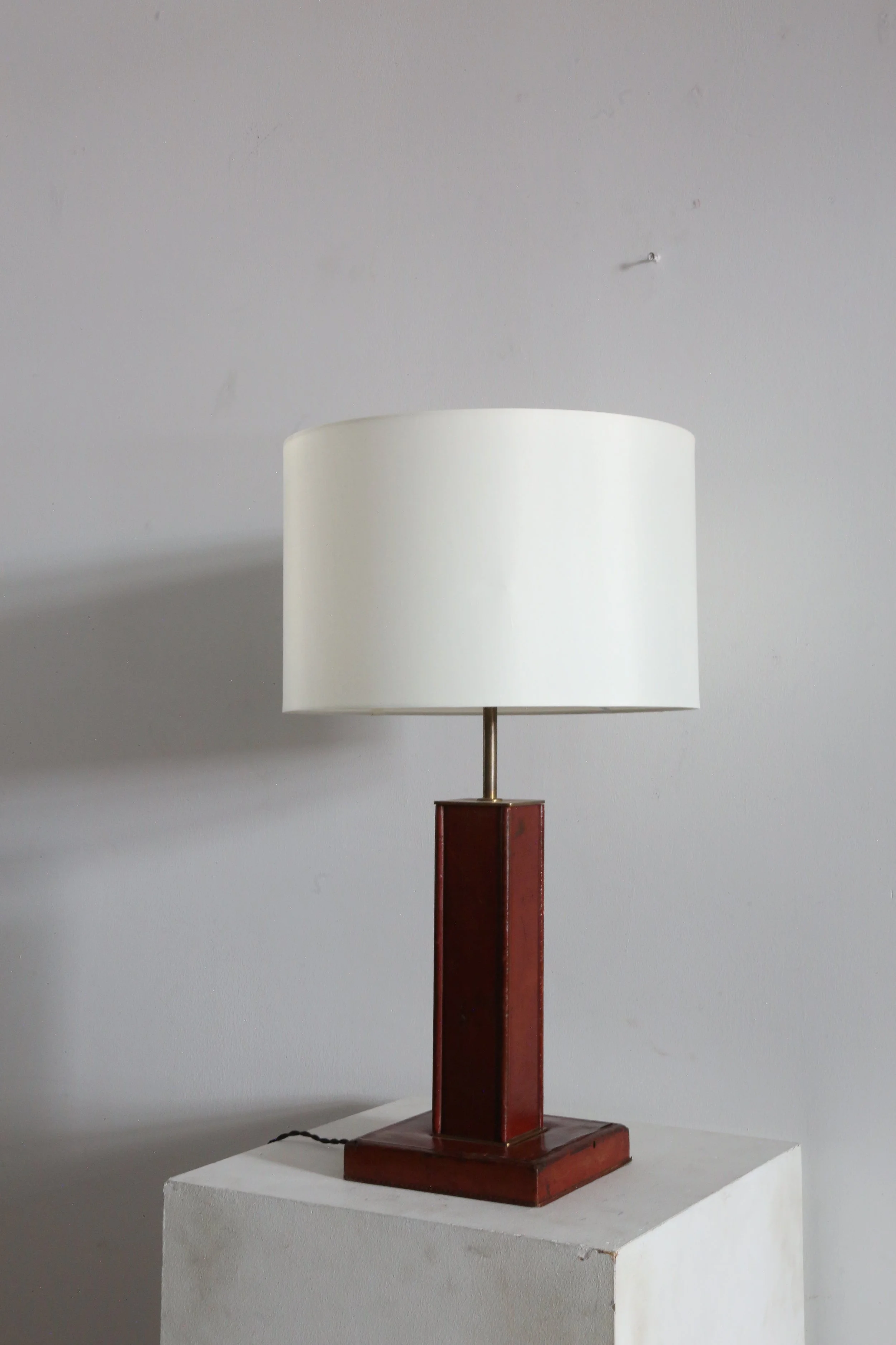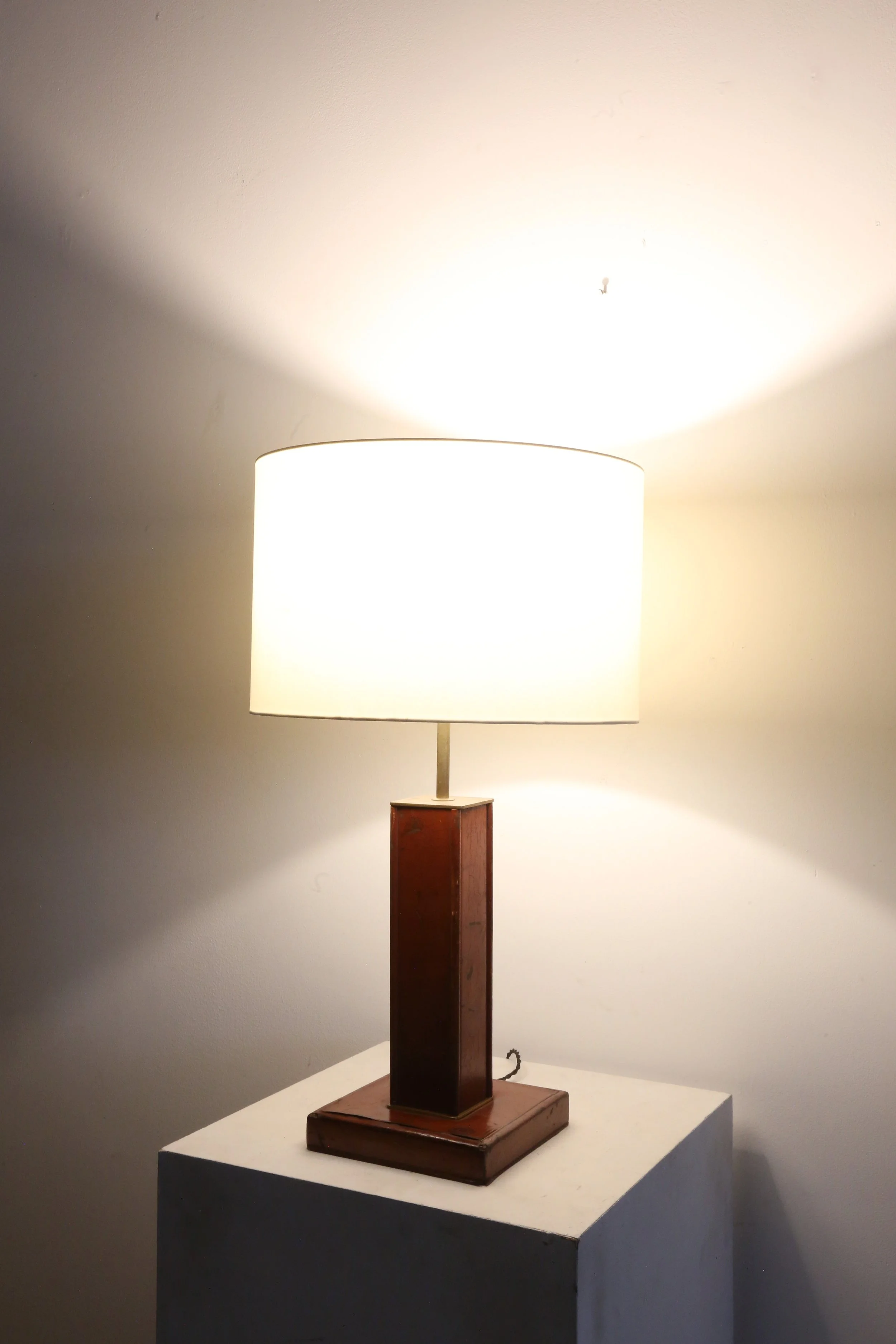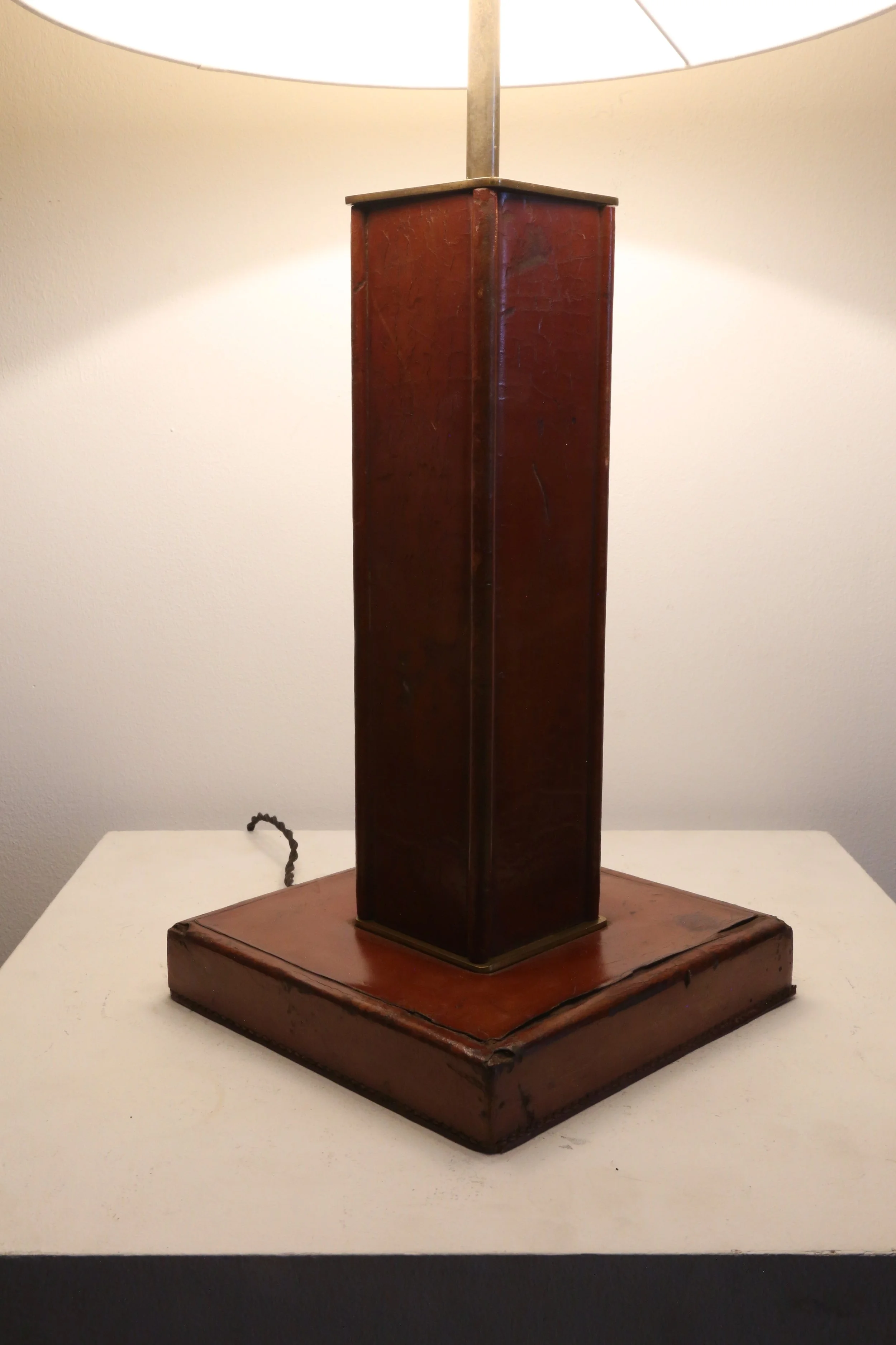 Saddle stitched ox blood red lamp, with brass banding and details.