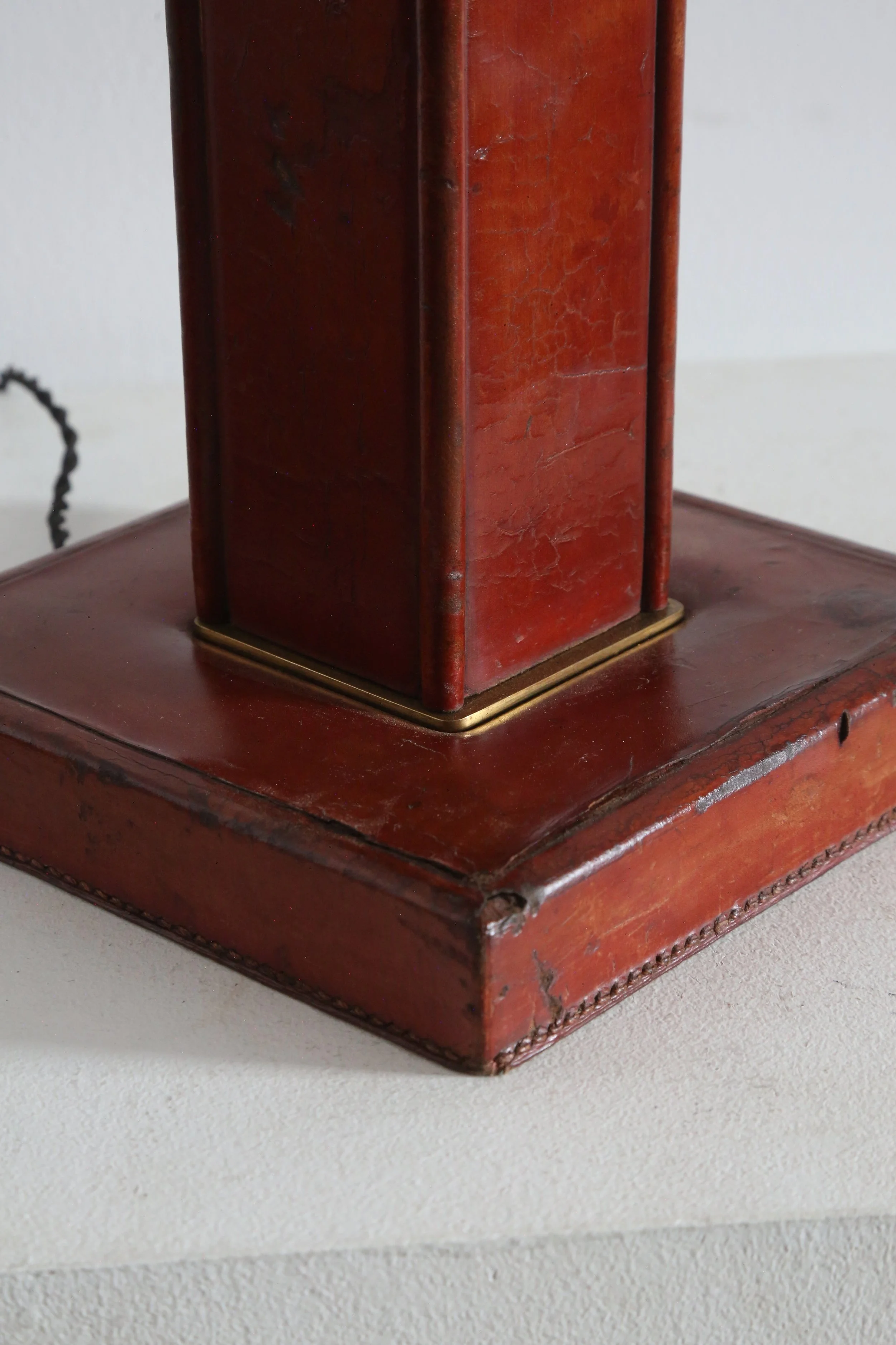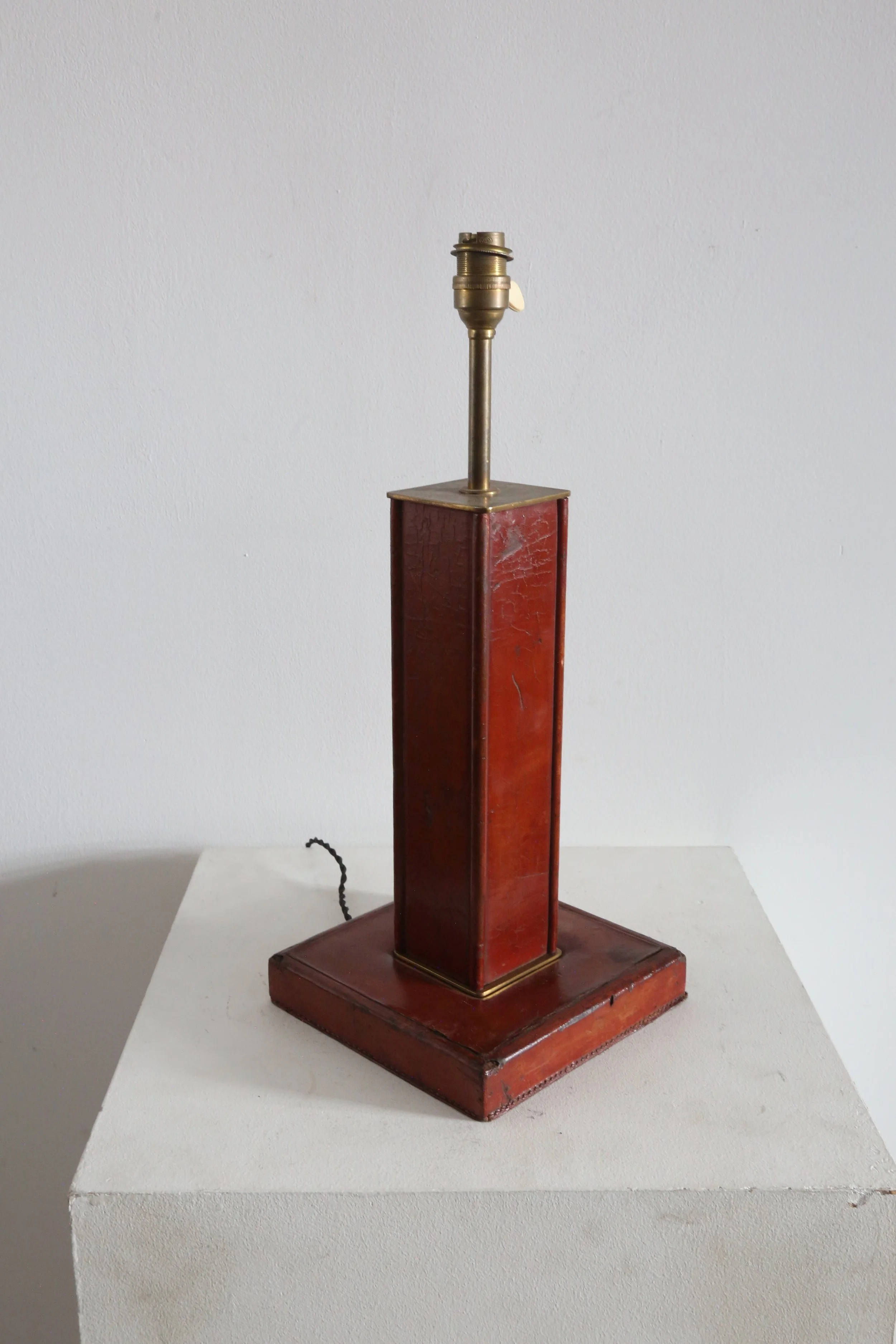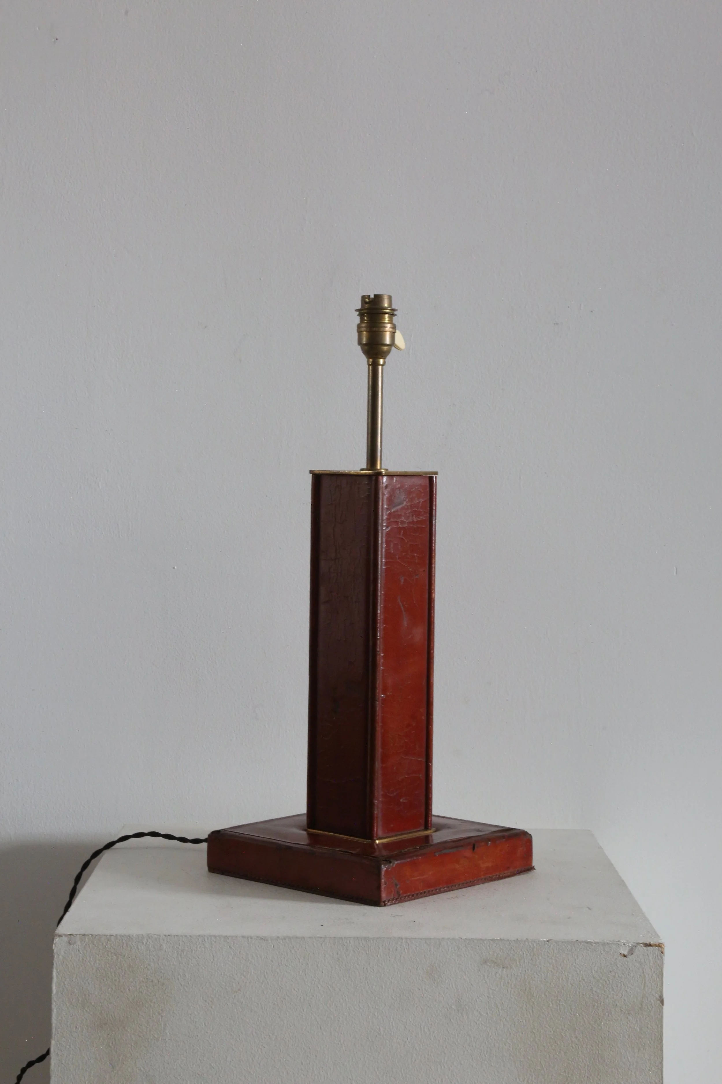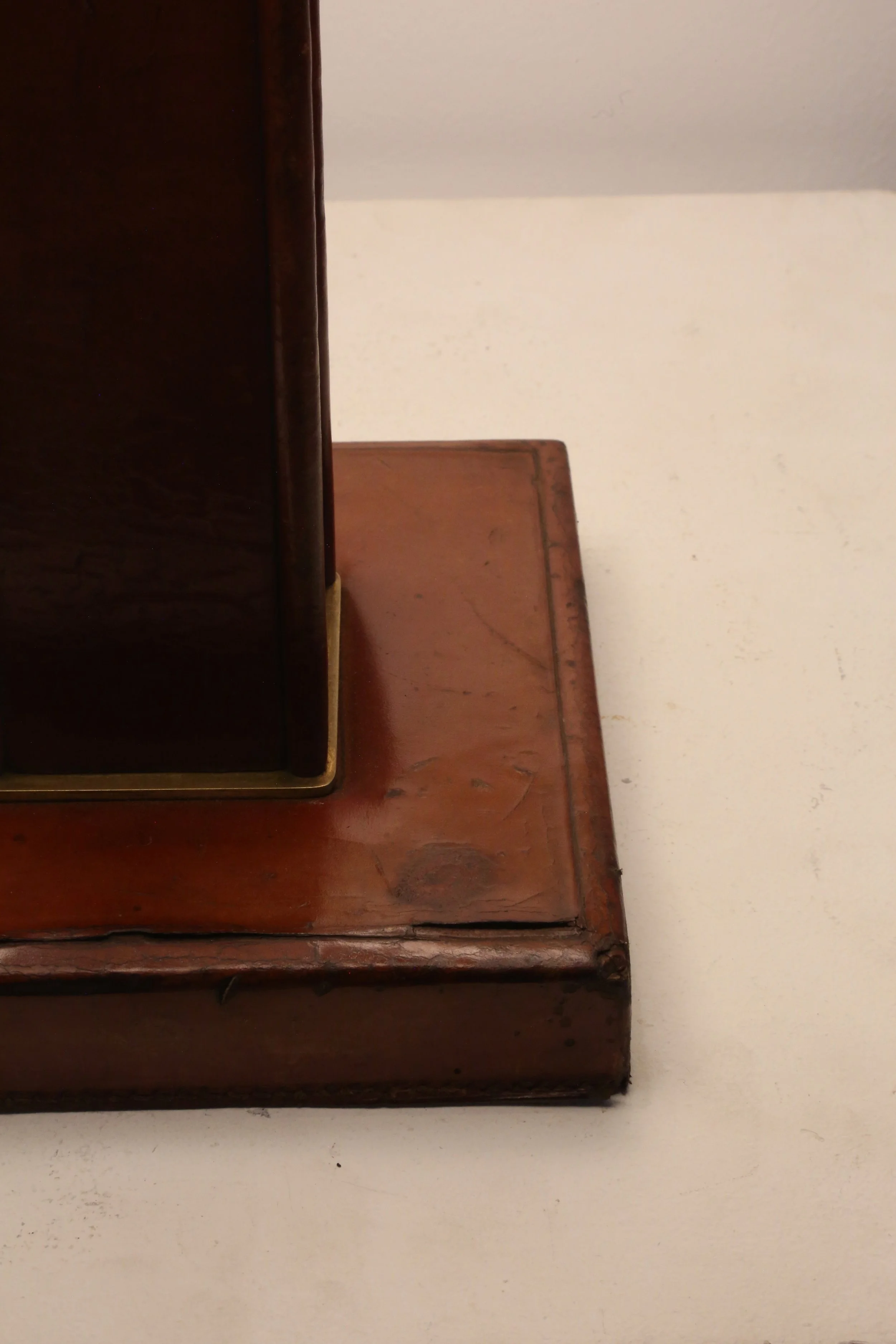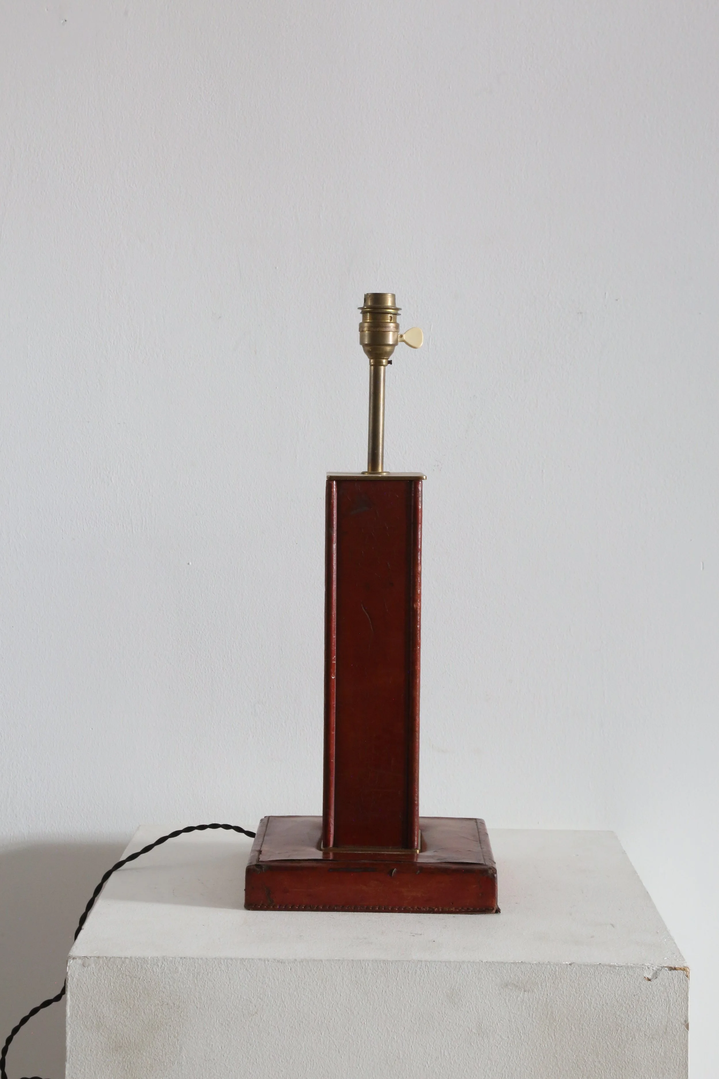 Saddle stitched ox blood red lamp, with brass banding and details.