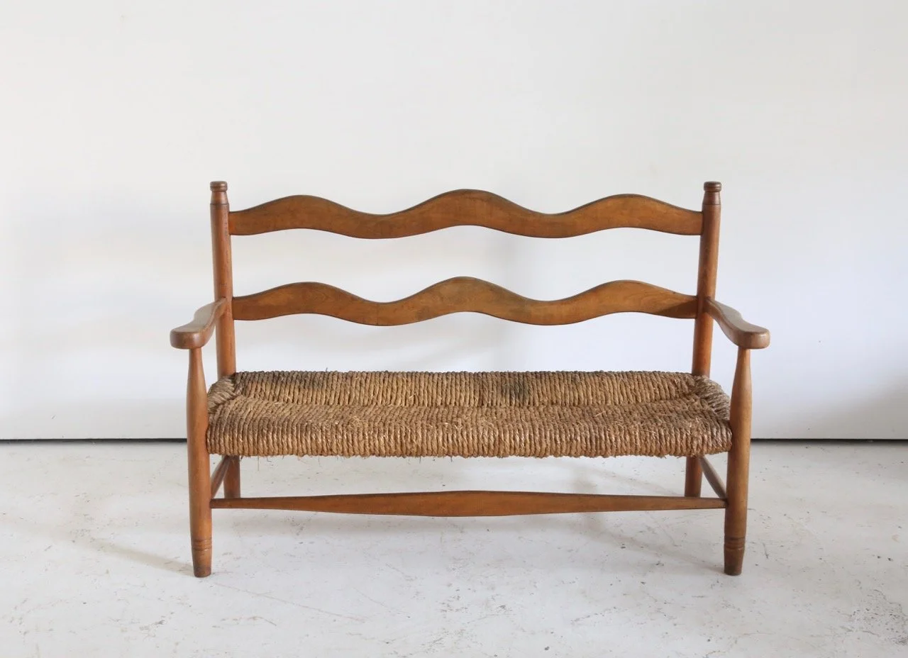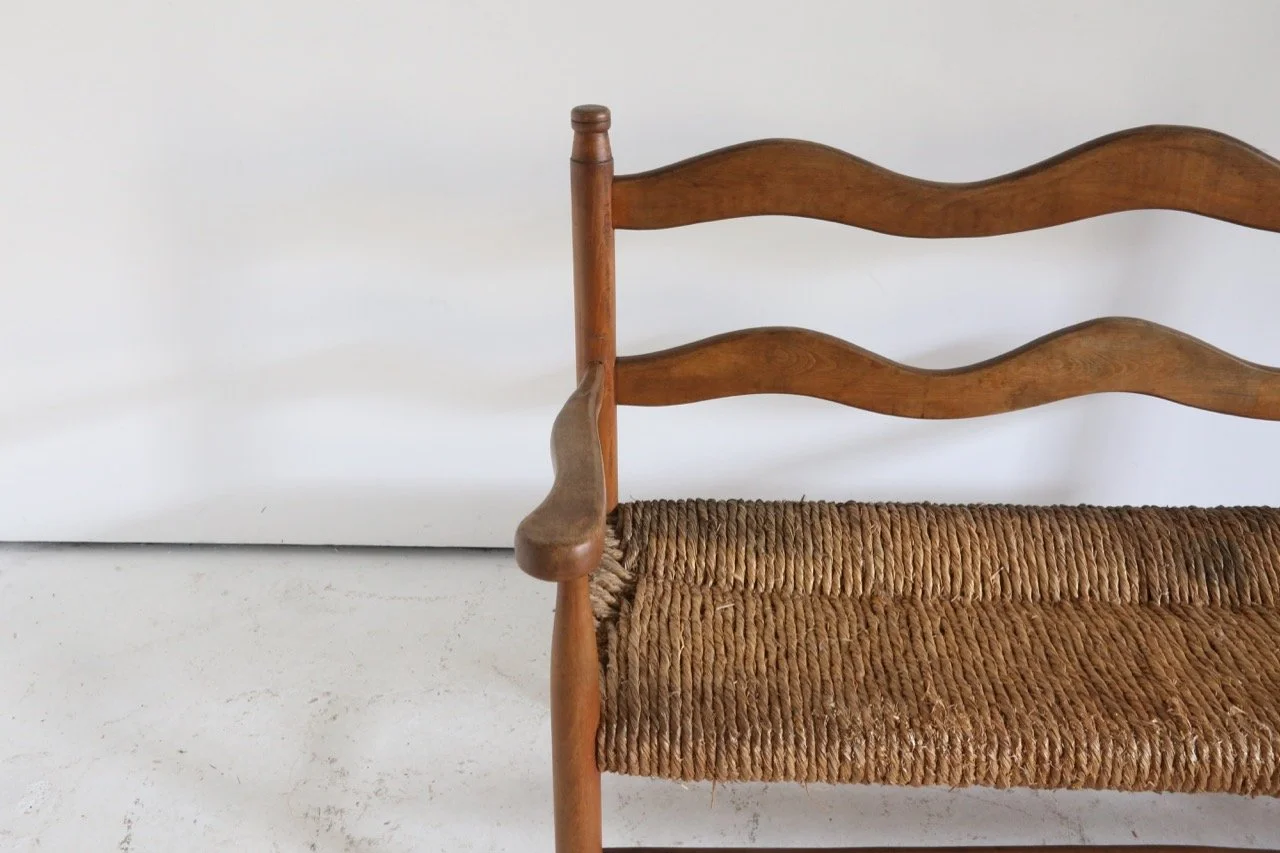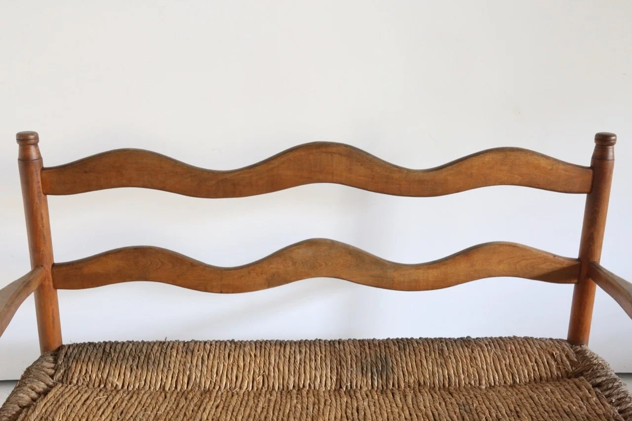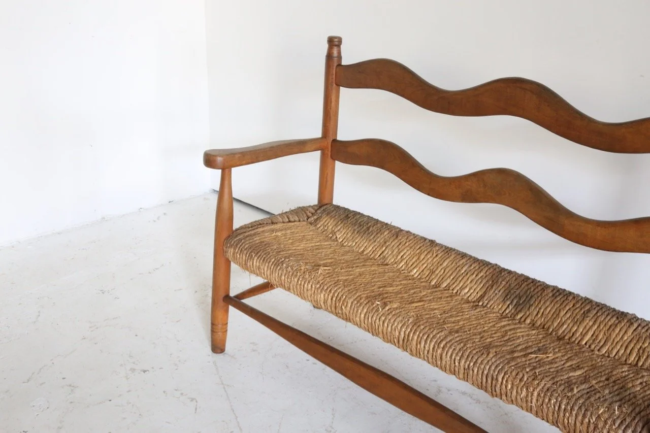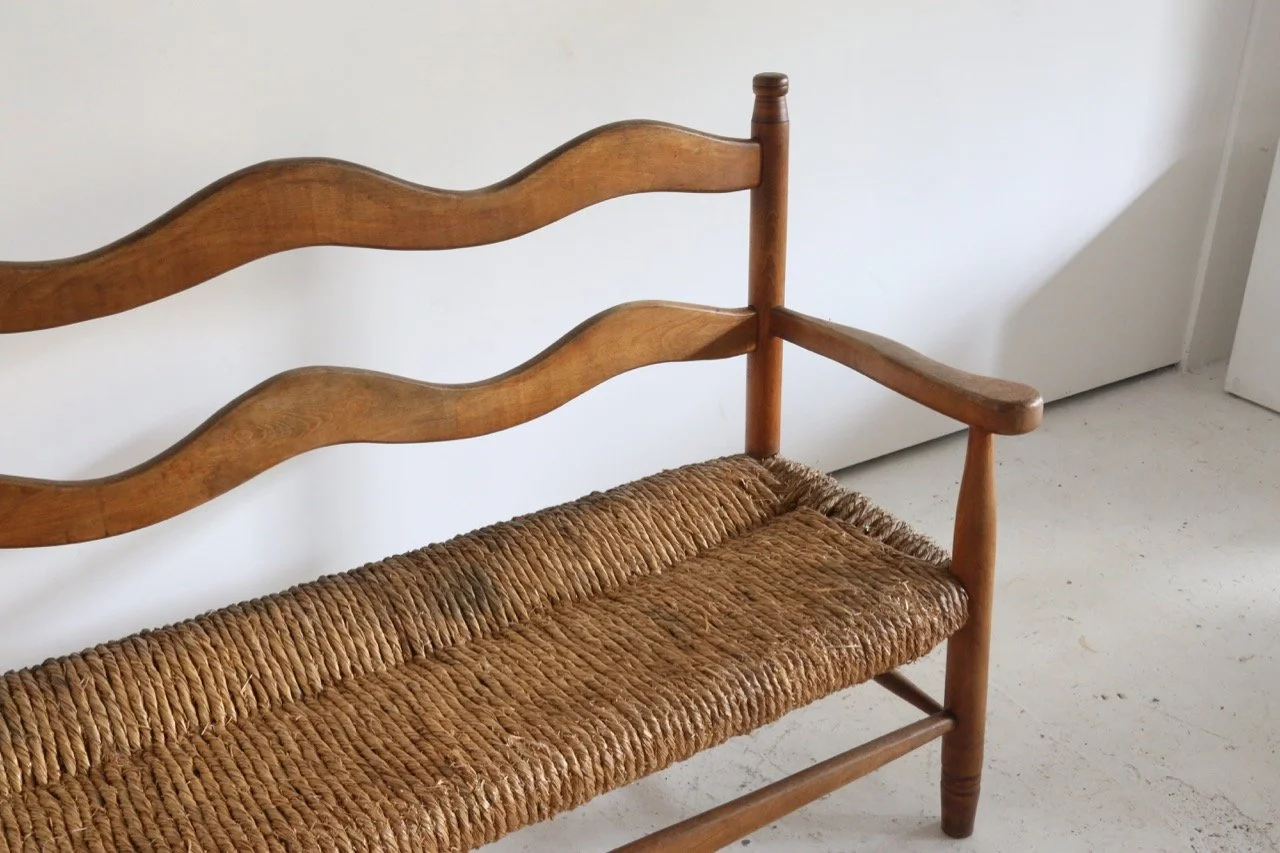 Hugely characterful rush seated bench which has lived a long and healthy life in the French Pyrenees since the 1950s.