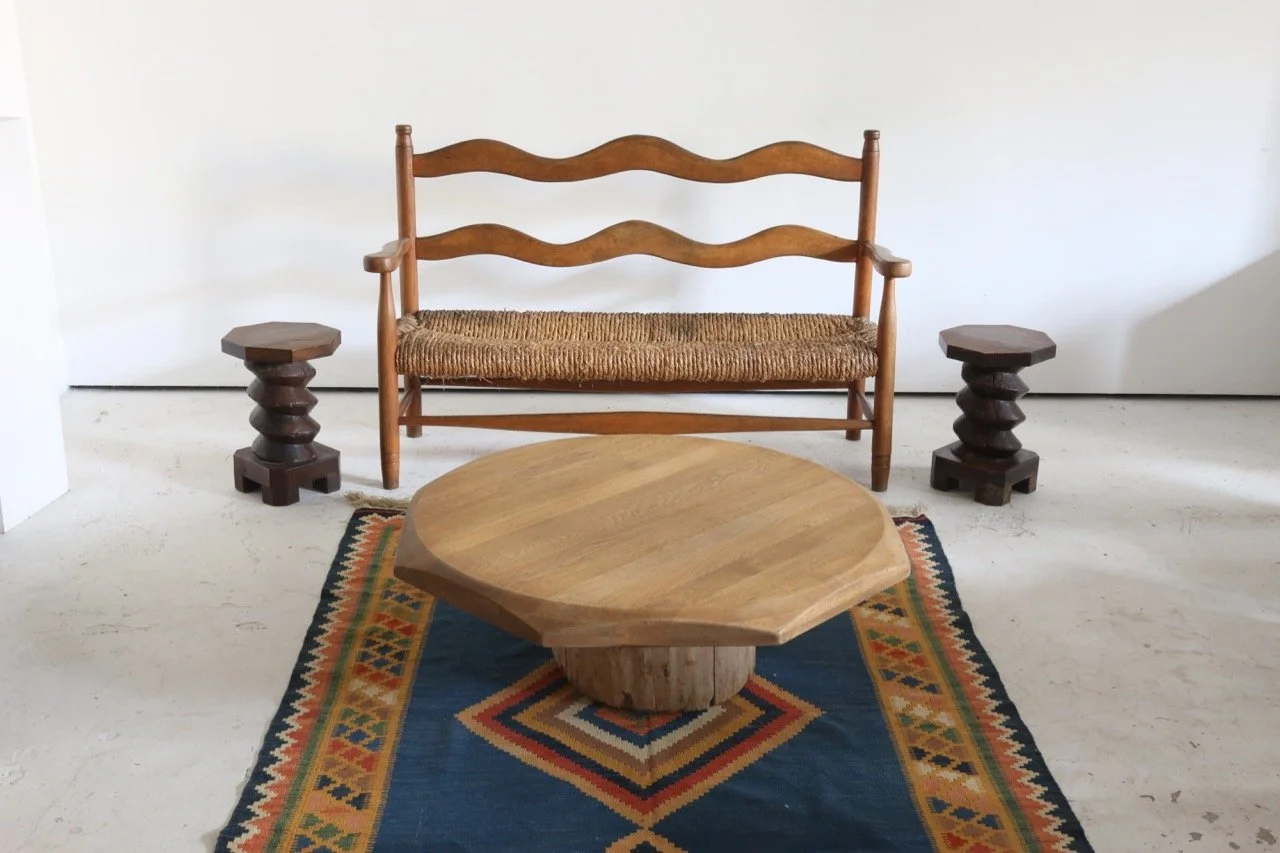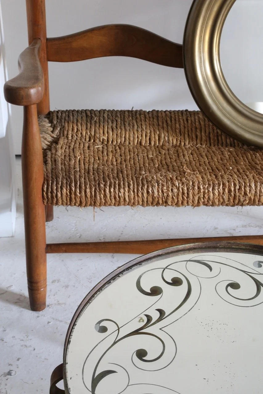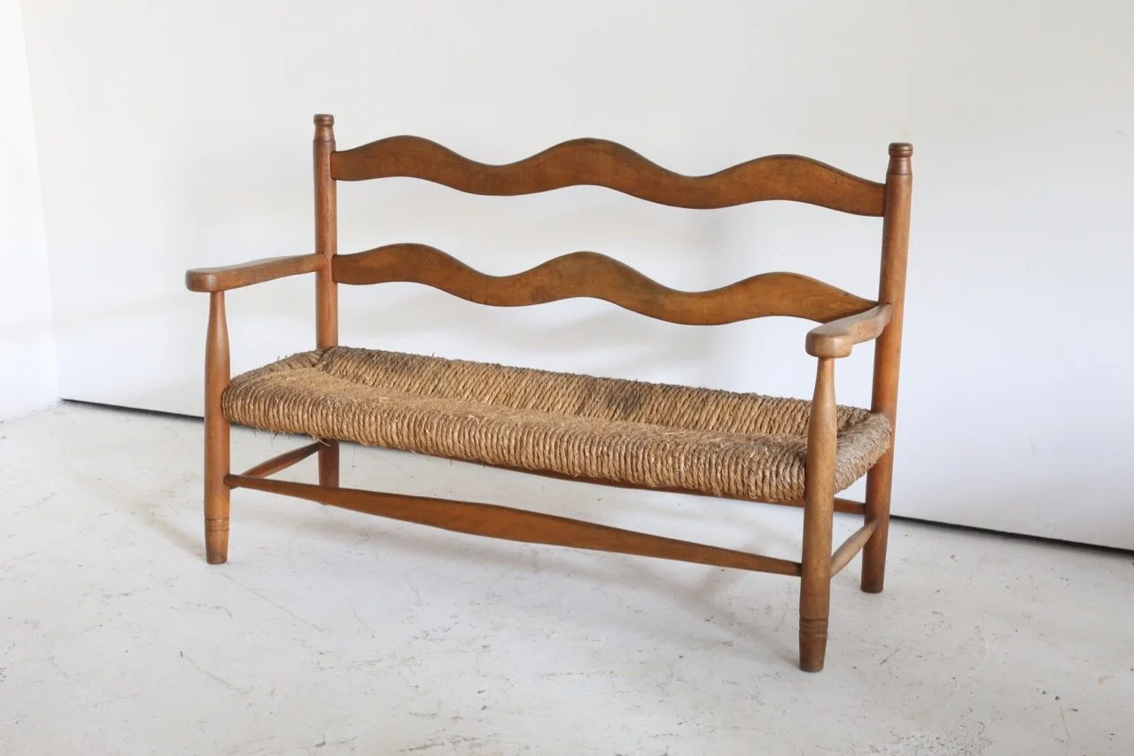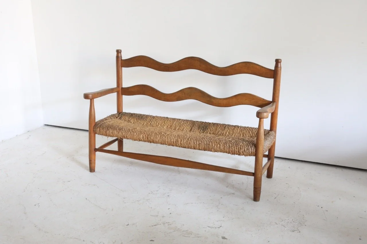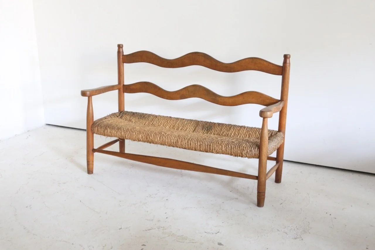 Hugely characterful rush seated bench which has lived a long and healthy life in the French Pyrenees since the 1950s.